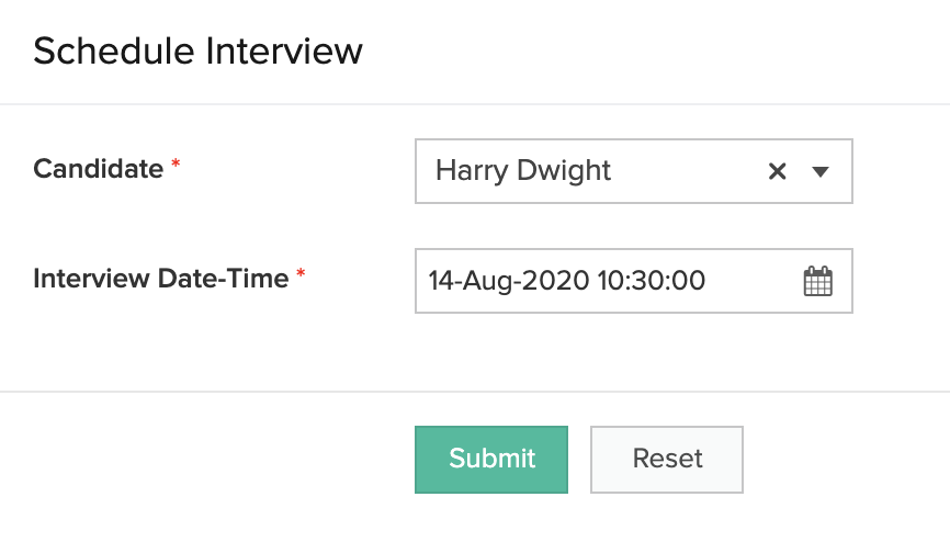 - The manager will select a candidate and set their interview's date and time, and then click Submit: