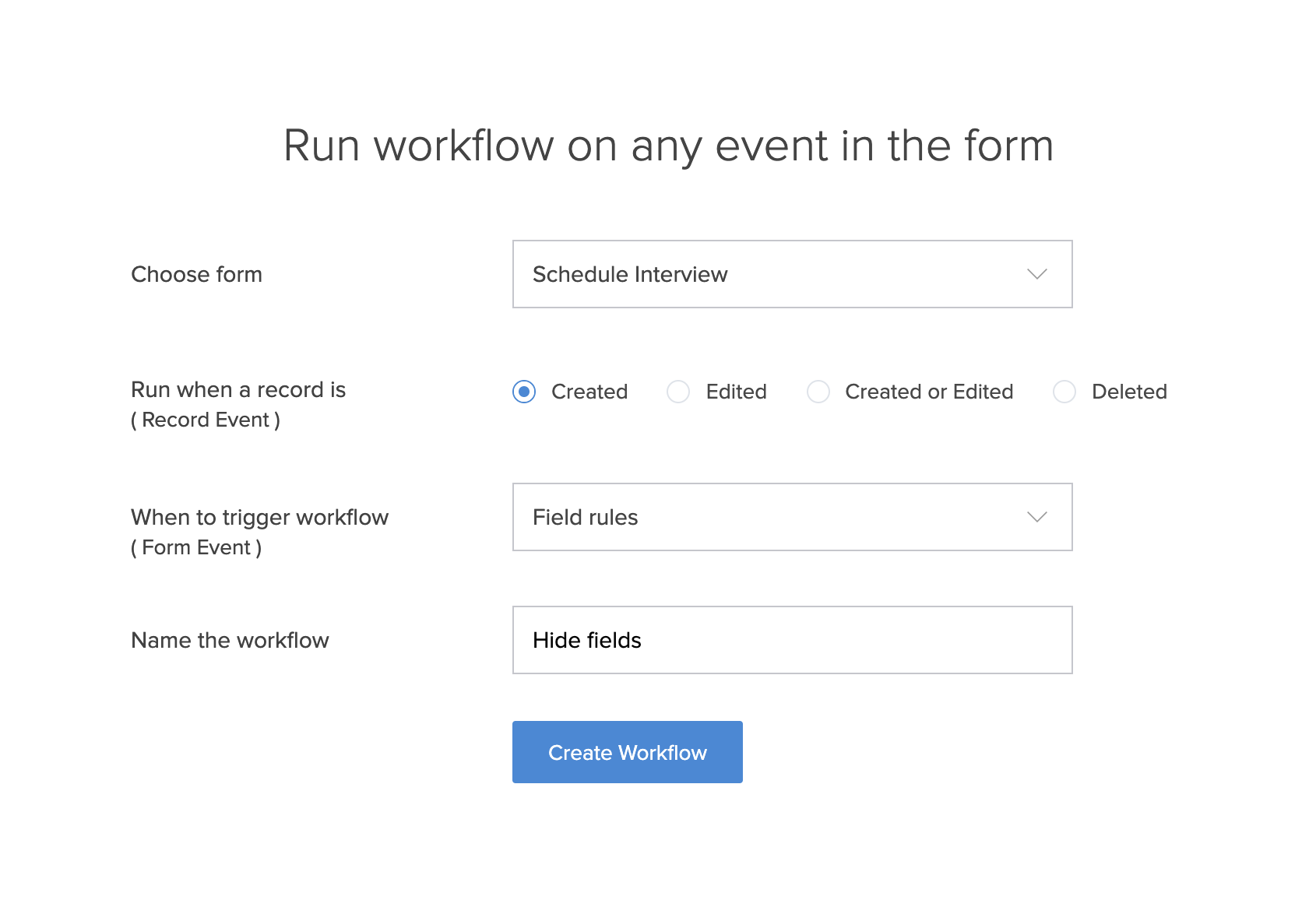 - To create a workflow to send interview details to candidates and update candidate records:Note: Before creating a workflow to send email, you need to configure the mail server. Learn how