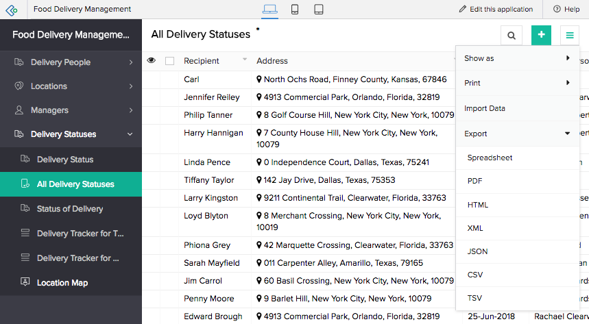 Exporting records help you obtain or download the records that are in AppCreator report into a specific format for a purpose outside of ManageEngine AppCreator environment. AppCreator enables you to export your reports in a few simple steps so that you can access them offline and email them to your colleagues who are non-ManageEngine users. You can perform export operations across all the three platforms supported by AppCreator — web, mobile, and tablet.