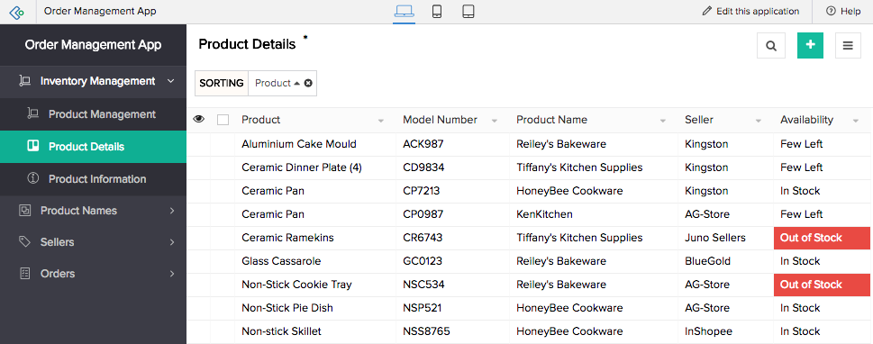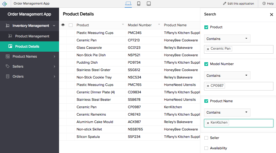 The search option helps you sift through voluminous records and narrow down to information that you require. Let's assume you have an inventory management app. You have a report that displays product details of all the items in the inventory. If you are looking for a particular product, of particular model, from a particular manufacturer to update the stock details, you can use search. Click on the search field. All the fields in the report are listed. Select the fields that would help you single out the required records. In this case, select Product field, select the operator "is" enter the name of the product; select model field, select the "contains" operator and enter the model number; select manufacturer field.