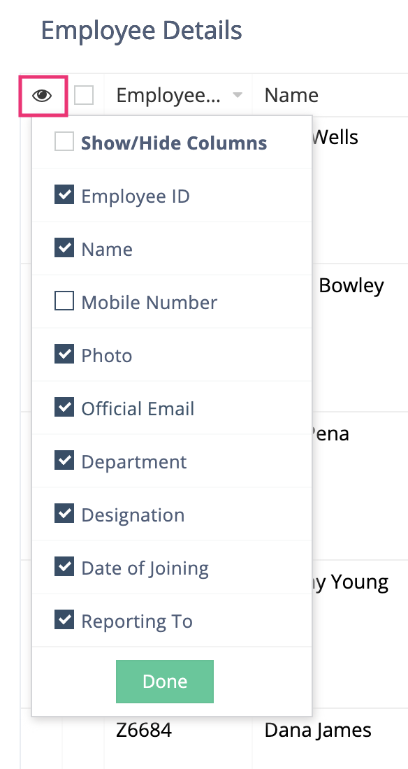 Hiding a column prevents the viewer from being able to view certain columns that you deem unnecessary. Clicking the icon at the left end of the header row will display the fields that you want hidden. Unchecking the field names will hide those columns. To make them appear again, you have to select the unchecked field names. To hide a column in your report, follow the below steps: