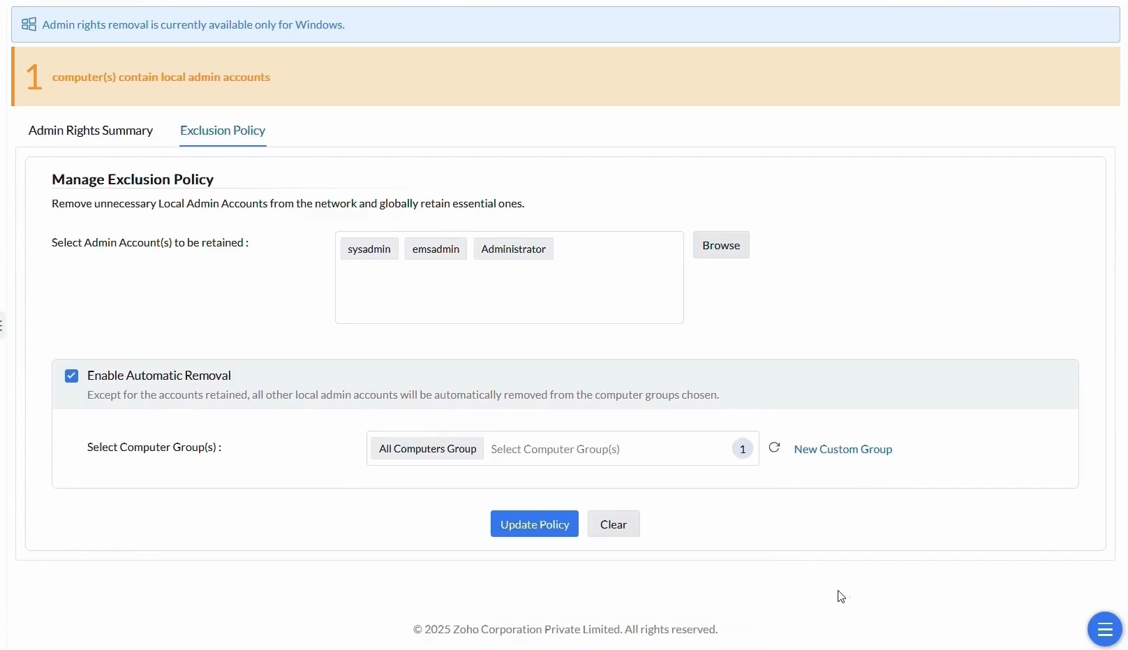 ManageEngine Application Control Plus' endpoint privilege management simplifies the cleanup of local admin accounts with automatic admin rights removal. Once an exclusion policy is configured to protect essential accounts, you can enable automatic removal, and the system takes care of the rest—removing unnecessary admin privileges to reduce your organization’s attack surface, all without manual intervention. It’s all about trimming the excess while keeping critical access in place.