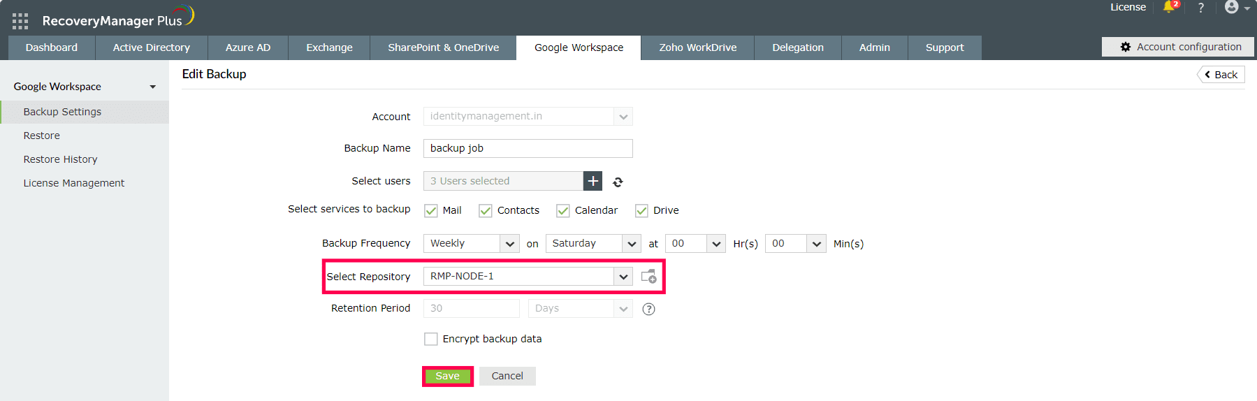 RecoveryManager Plus provides support for multiple repositories to store your Active Directory, Entra ID, Microsoft 365, Exchange, Google Workspace, and Zoho WorkDrive backups.