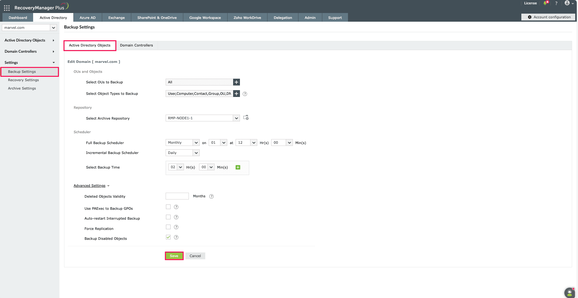 2. Navigate to the Active Directory tab > Active Directory Objects > Settings > Backup Settings > Active Directory Objects.