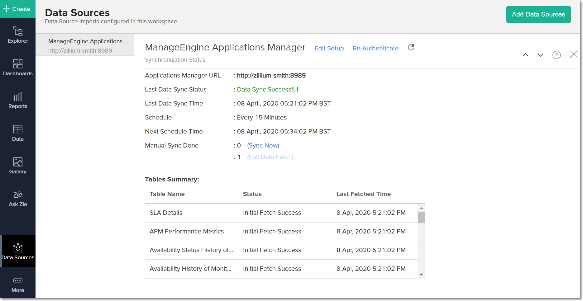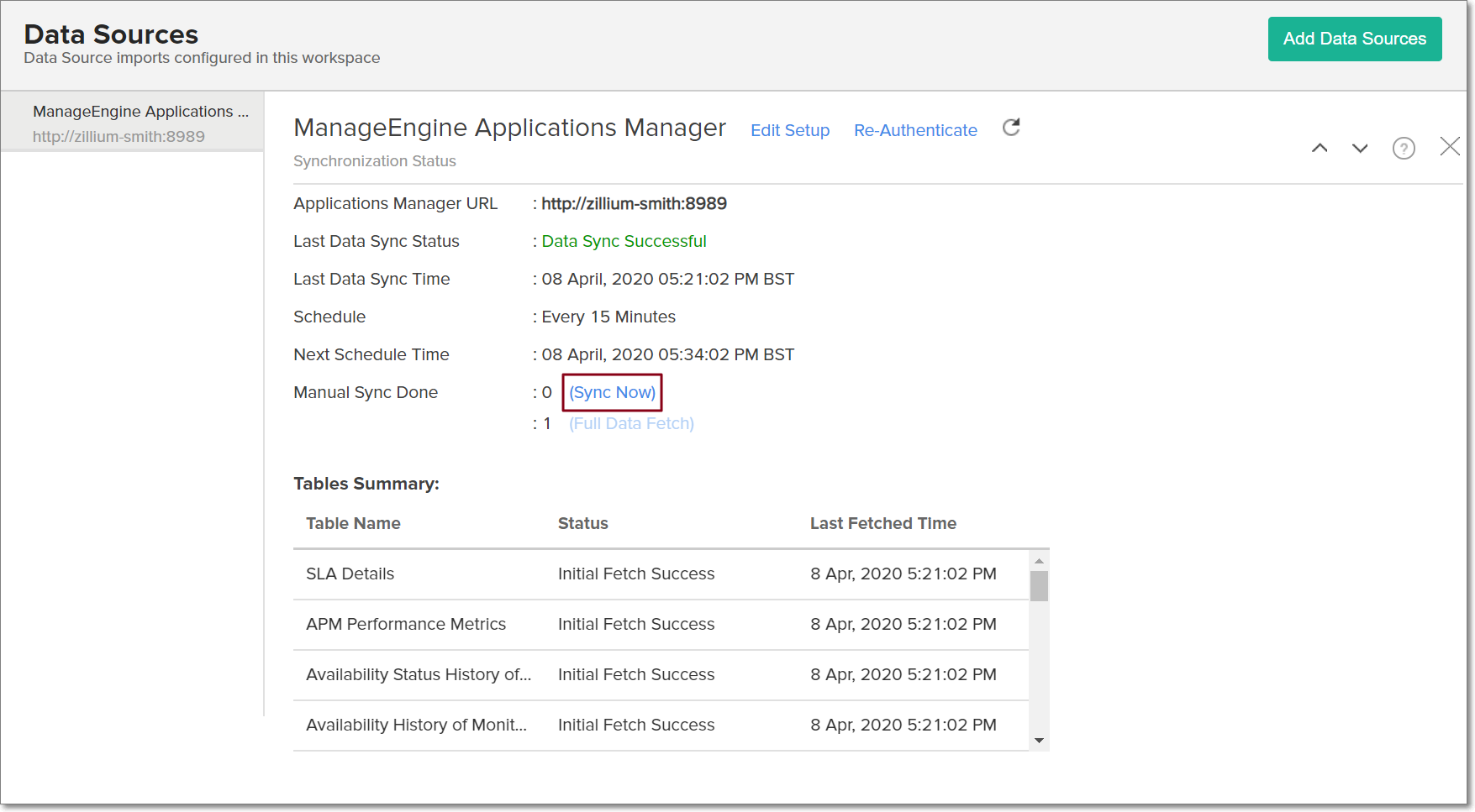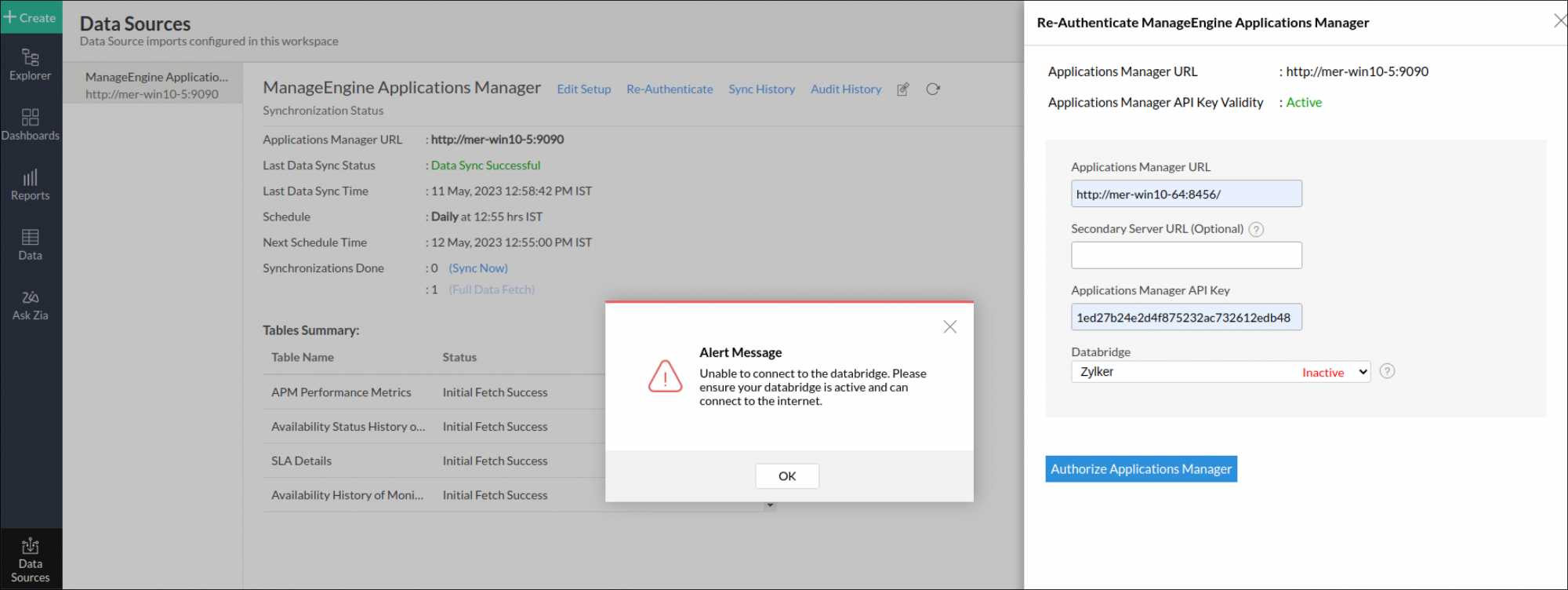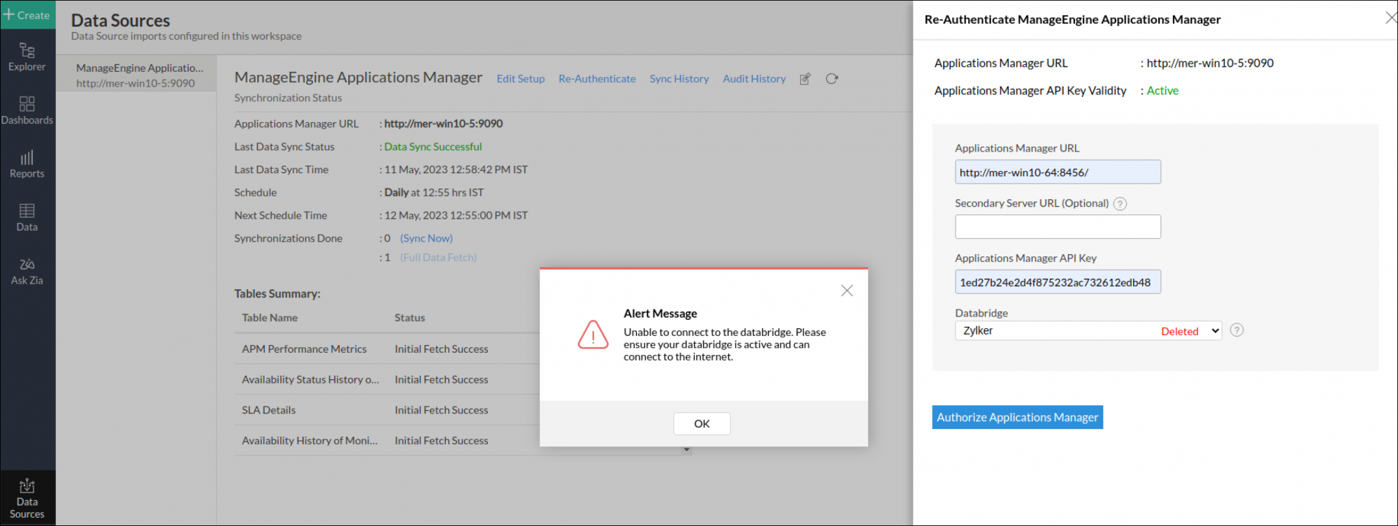 The synchronization of your Applications Manager data can sometimes fail, due to a variety of reasons. To resolve this, click the Data Sources option from the side panel and click the Re-Authenticate link. In the popup that appears, click Authorize Applications Manager. Verify the Applications Manager URL, enter the regenerated API key, select the required ManageEngine Databridge from the Databridge drop-down, and click the Authorize Applications Manager button.