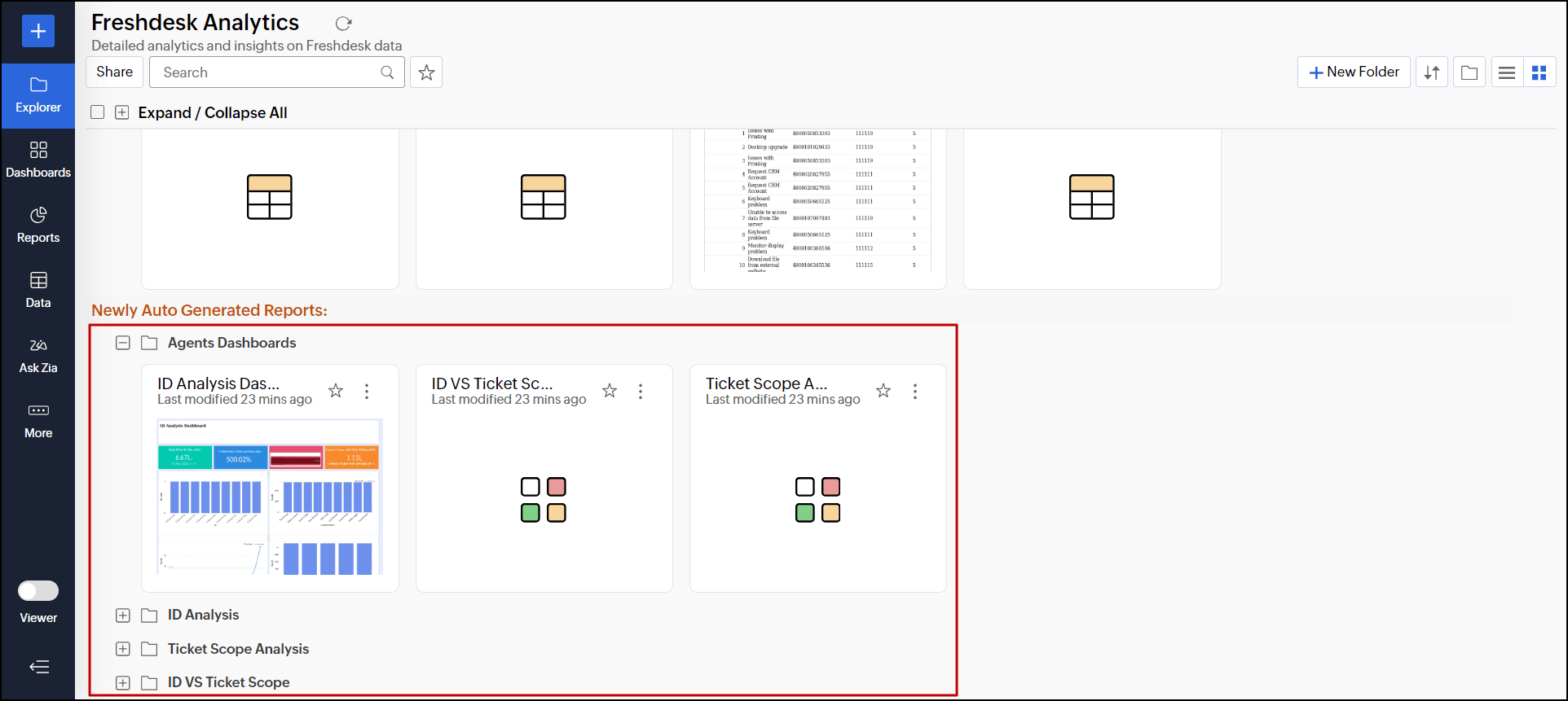 The Auto Analysis feature in Analytics Plus allows you to turn raw data into insights within minutes. It utilizes generative AI, machine learning, and natural language processing to comprehend the metadata and data structure to generate reports and dashboards accordingly.