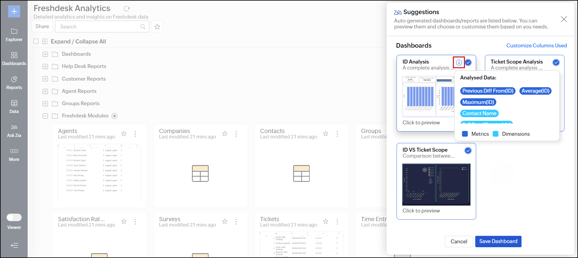 Analytics Plus analyzes the schema of the table data, identifies key metrics, measures, dimensions, and date columns, and automatically generates reports and dashboards.