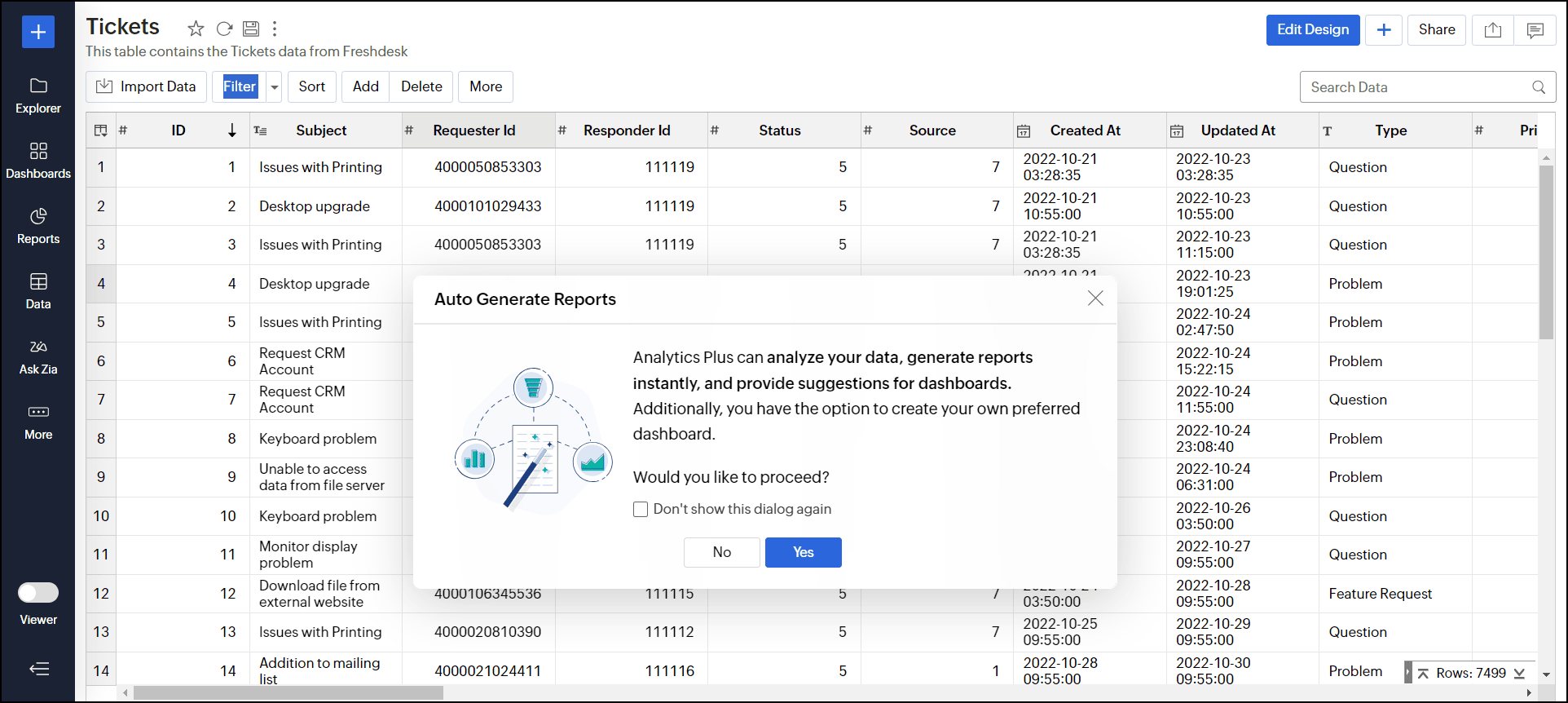 After successfully importing data into a new table, Analytics Plus will prompt you to auto-generate reports and dashboards. In the pop-up that appears, click Yes to proceed.