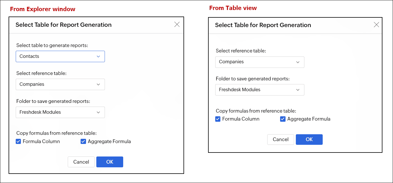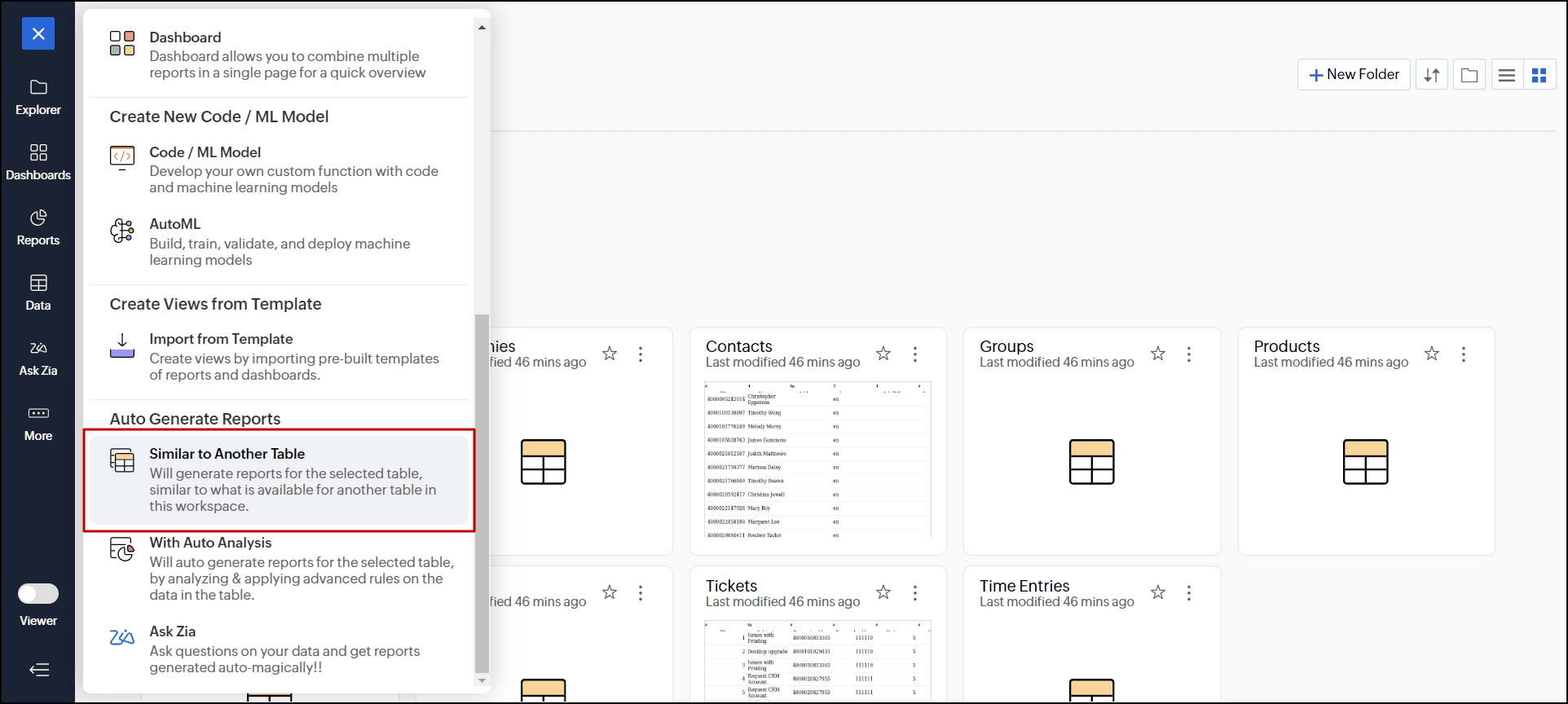 You can also do this from the Explorer window, click the + (Create) button on the left side panel, and choose the Similar to Another Table option. In the pop-up that appears, select the table for which you need to generate reports from the Select table to generate reports drop-down.