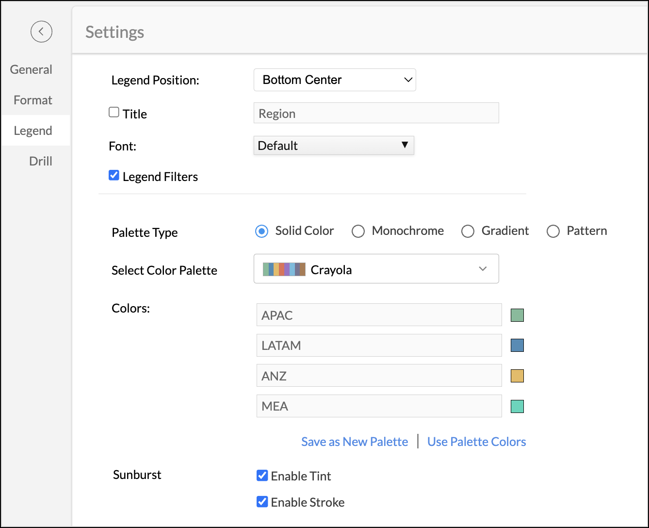 Access the Legend tab to customize the appearance of the sunburst chart.