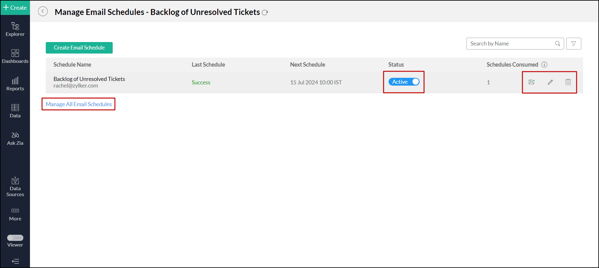 Analytics Plus lets you manage the email schedules of a particular view from the Manage Email Schedules page. Follow the steps below to do this:
