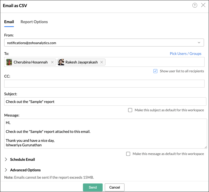 Note: The Set Password option will only work when reports are sent as attachments and not when they're emailed as inline images. - You can also schedule this email to be sent at periodic intervals (refer this section).
