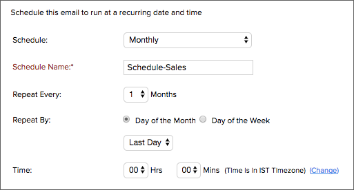 | Repeat By: | Specify the day of the month when you want to email the view. This field contains two options. 1. Day of the Month : Example - 15th of every month or last day of the month; 2. Day of the Week : Example - 3rd Tuesday of every month. |