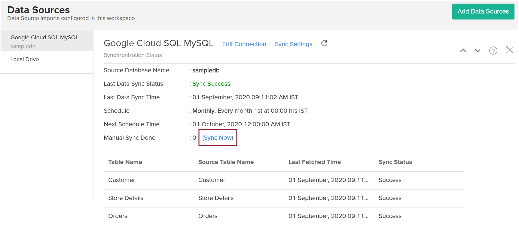 Select the Data Sources option from the side panel, and navigate to the required Google Cloud SQL MySQL data source.