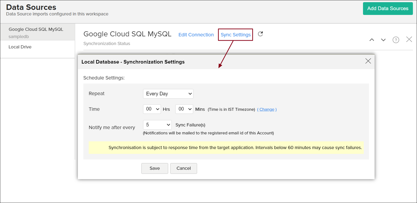 If you have created reports in Analytics Plus over columns or tables that don't have a direct mapping to the data in the database, mismatches will occur. These mismatches will be listed in the Cloud Database Connection Settings page, which can be accessed by clicking the Data Sources button from the side panel. Refer the following question to know more.