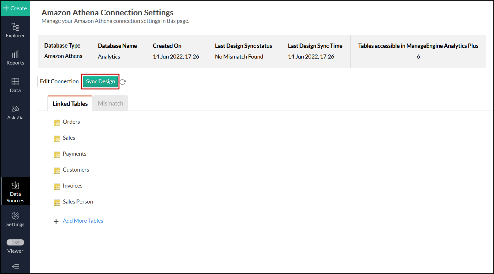 In Analytics Plus, a mismatch occurs ‌when the tables and columns in your Analytics Plus workspace don't have a direct mapping to the data in the database. ‌In case of any mismatches, Analytics Plus will not be able to fetch appropriate data from the Amazon Athena database. These mismatches are listed under the Mismatch tab of the corresponding Data Sources page. Refer to the following question to know more.