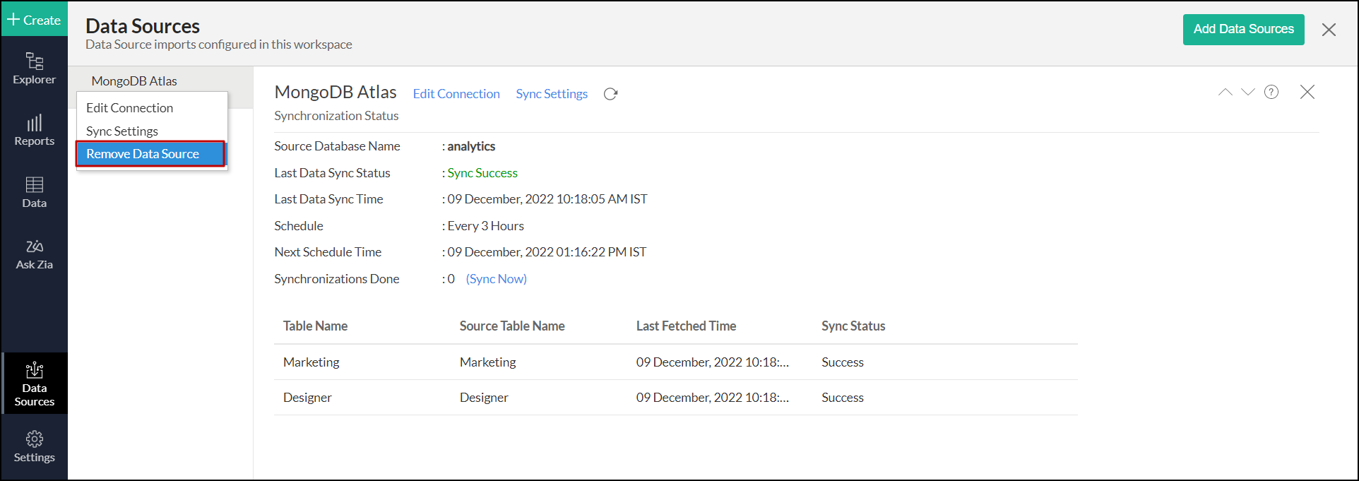 • Navigate to the required MongoDB Atlas data source and click the Sync Now link.
