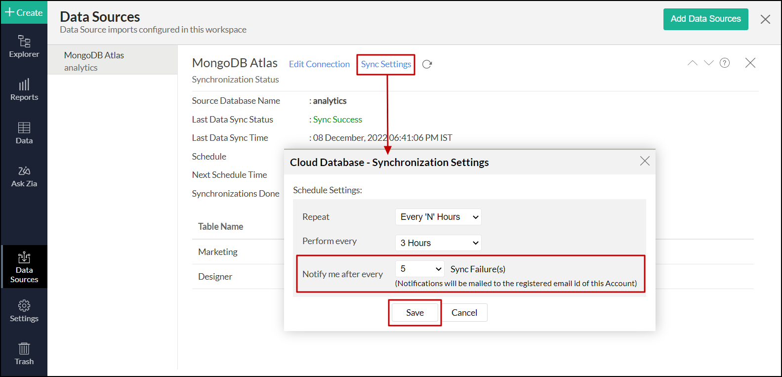 • In the pop-up that appears, choose the required option from the Notify me after every 'N' Sync Failure (s) drop-down to get notifications on consecutive import failures.