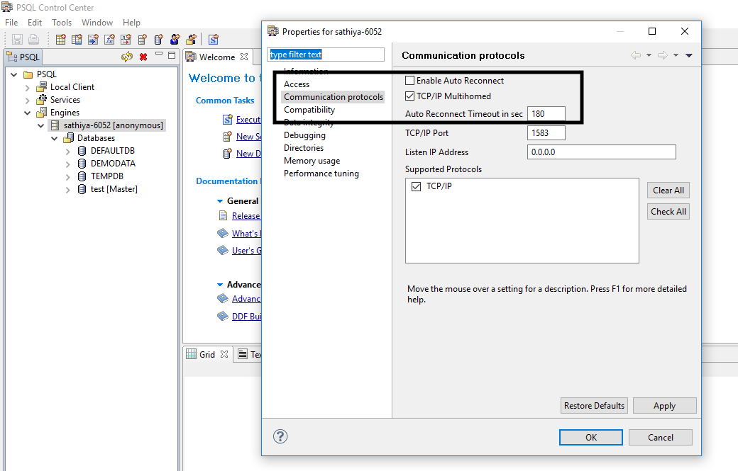 - Select Communication protocols. Enable the TCP/IP multihomed option.