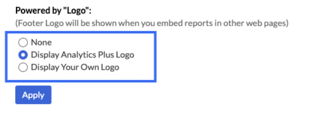 In the Powered by Logo section, select the option you want to display in embedded reports and dashboards. For exported reports, the logo is displayed only when the export is in image format.