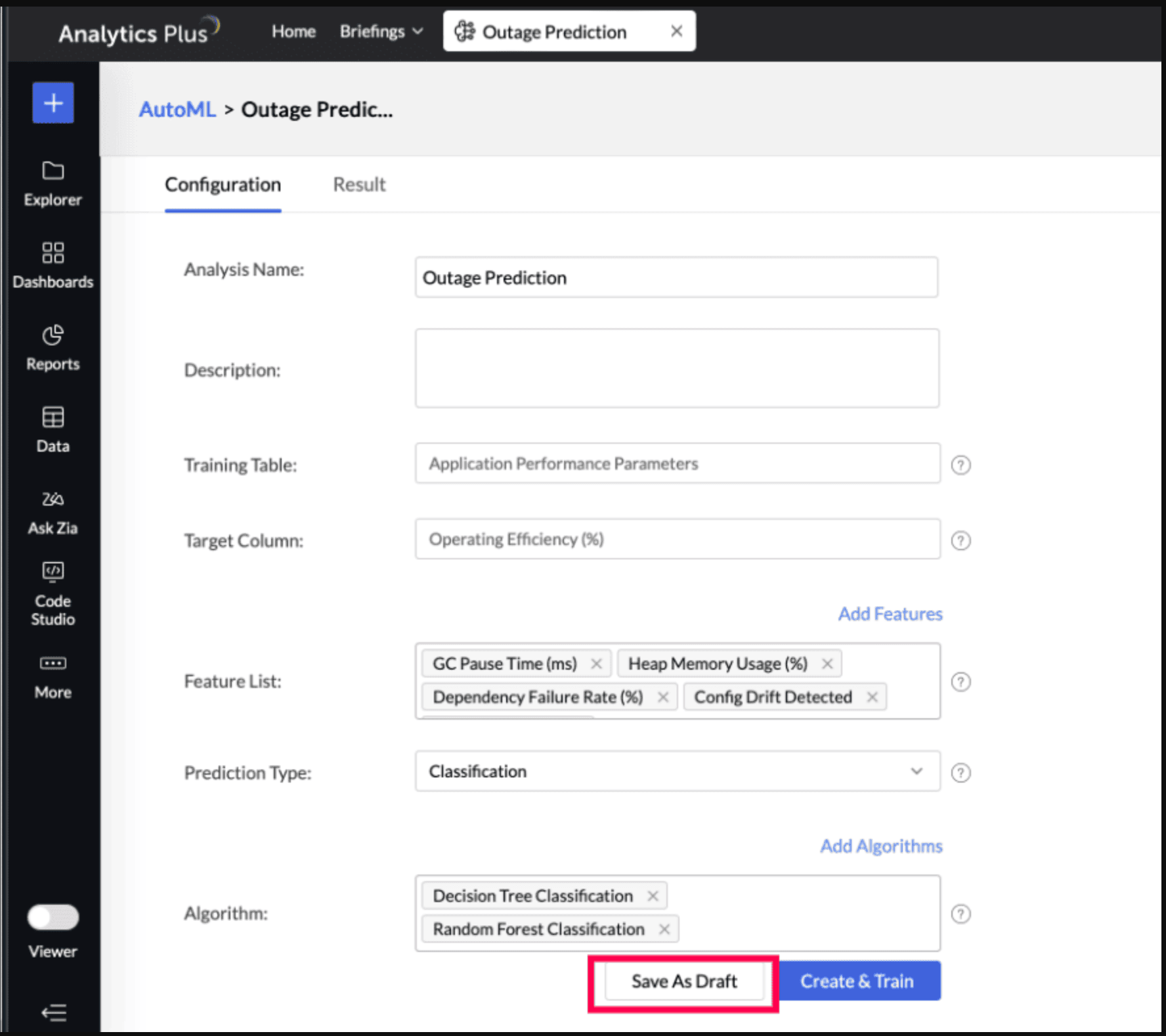 The Save as Draft option lets you preserve the model configuration, including algorithm selection and feature settings, so that you can initiate model training later at your convenience.