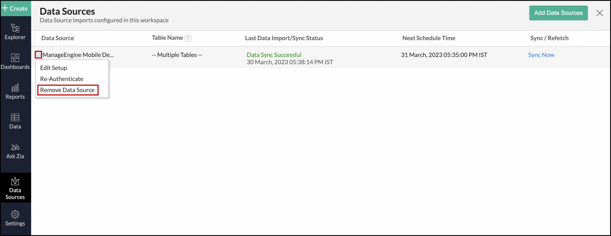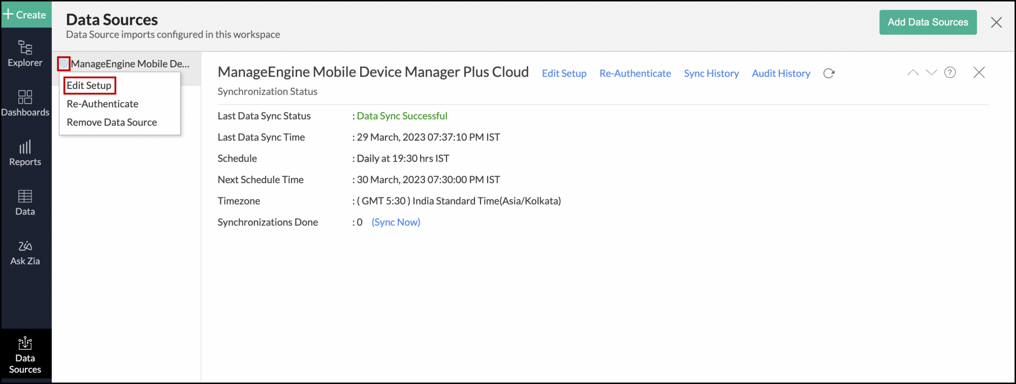 Click the Settings icon that appears on the mouse over the Mobile Device Manager Plus Cloud data source and click the Edit Setup option.