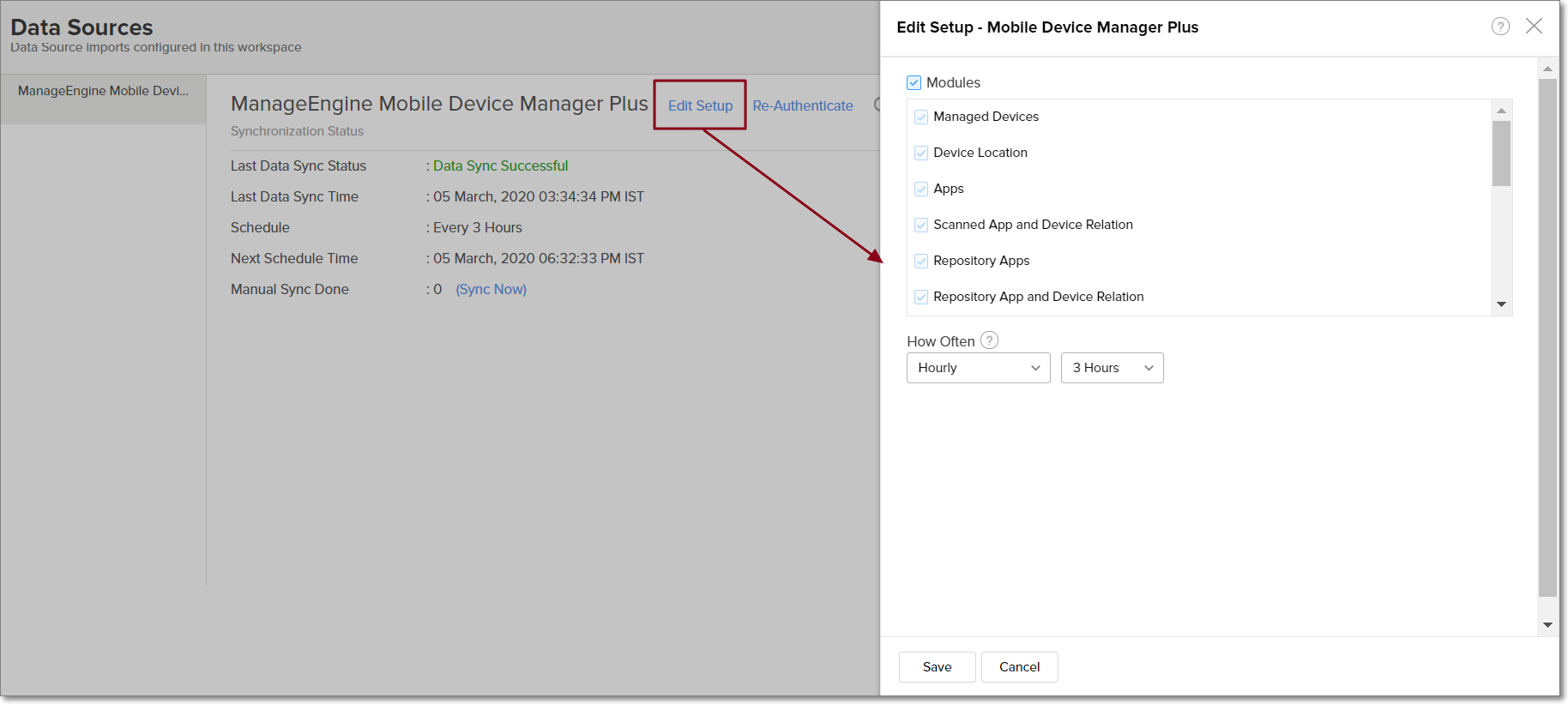 To edit the connection and synchronization settings, select Data Sources -> Mobile Device Manager Plus from the side panel.