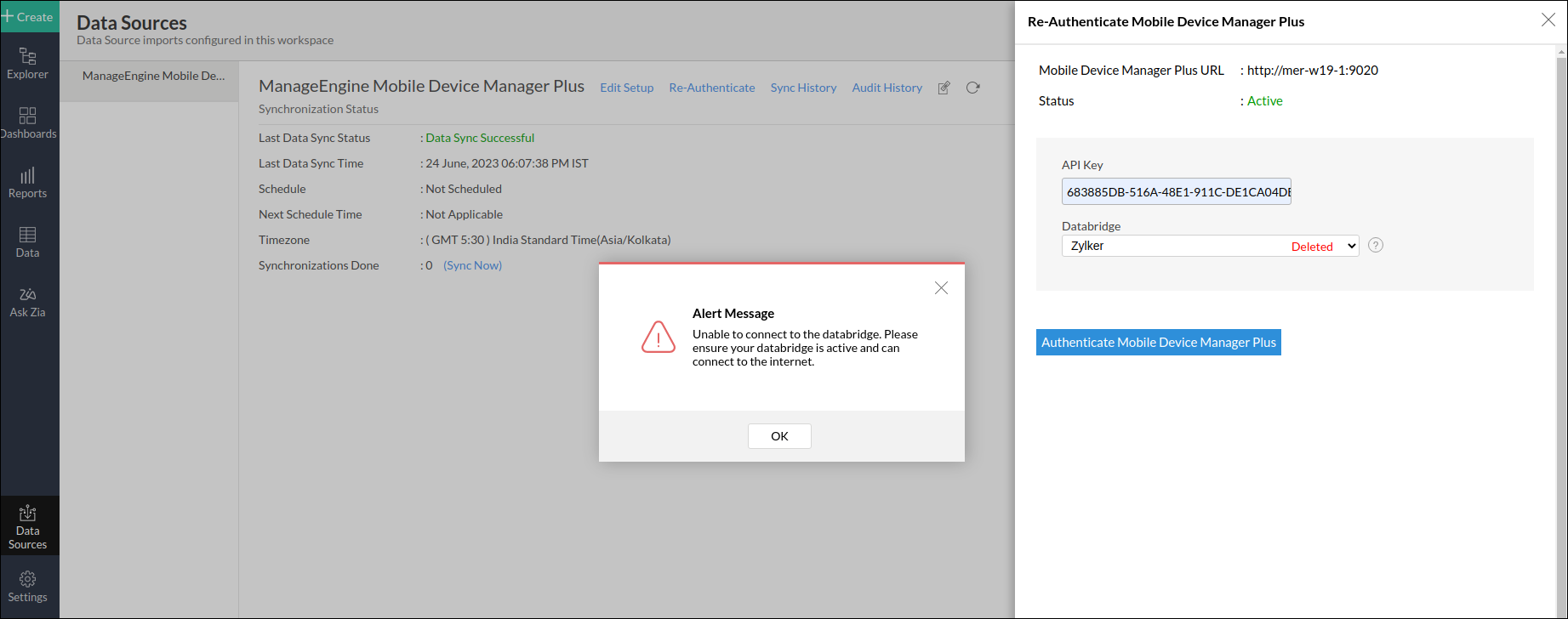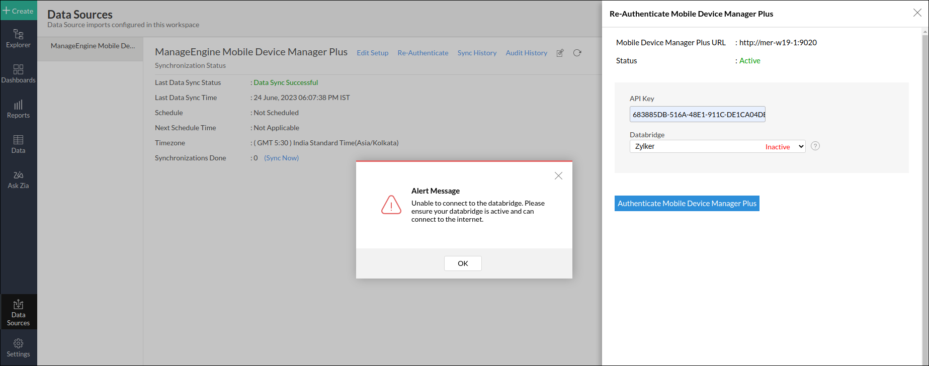 The synchronization of your Mobile Device Manager Plus data can sometimes fail, due to a variety of reasons. To resolve this, click the Data Sources option from the side panel and click the Re-Authenticate link. In the popup that appears, click Authenticate Mobile Device Manager Plus. Verify the Mobile Device Manager Plus URL, enter the regenerated API key, ‌select the required ManageEngine Databridge from the Databridge drop-down, and click the Authenticate Mobile Device Manager Plus button.