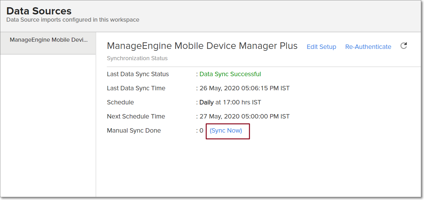 Yes. To do this, select Data Sources -> Mobile Device Manager Plus from the side panel. In the Data Sources page that appears, click Sync Now.
