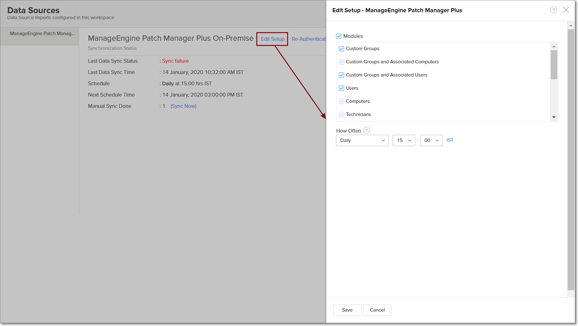 To edit the connection and synchronization settings, select Data Sources -> Patch Manager Plus from the side panel.