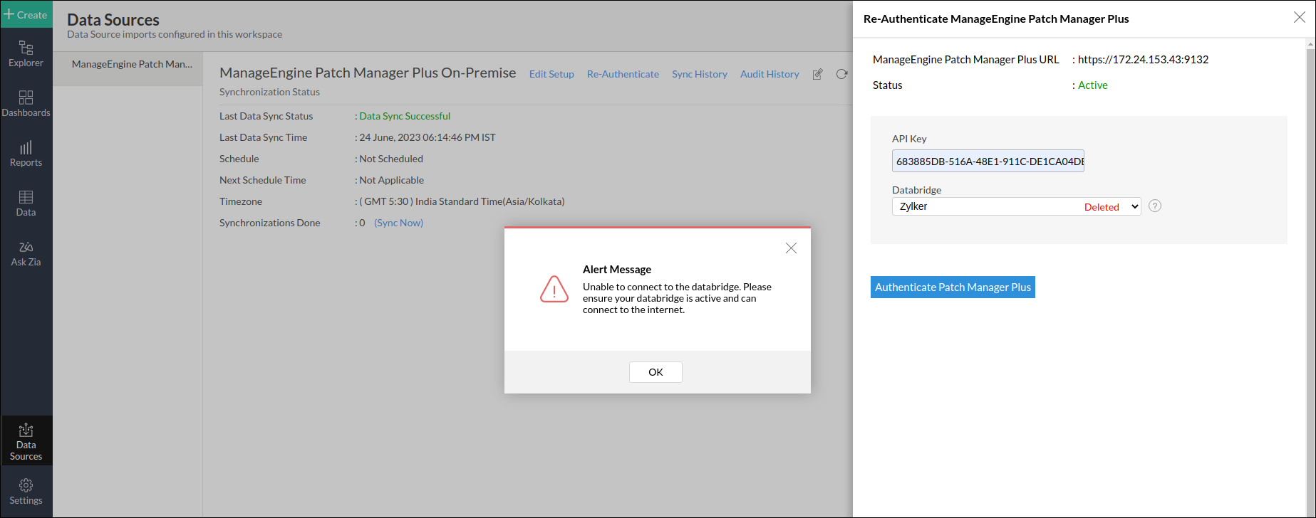 The synchronization of your Patch Manager Plus data can sometimes fail, due to a variety of reasons. To resolve this, click the Data Sources option from the side panel and click the Re-Authenticate link. In the popup that appears, click Authenticate Patch Manager Plus. Verify the Patch Manager Plus URL, enter the regenerated API key, select the required ManageEngine Databridge from the Databridge drop-down, and click the Authenticate Patch Manager Plus button.