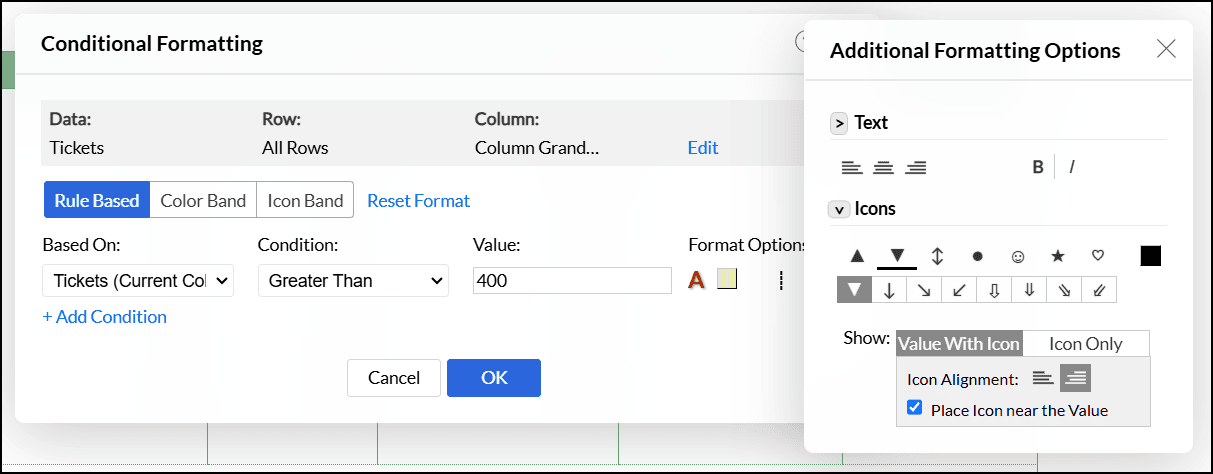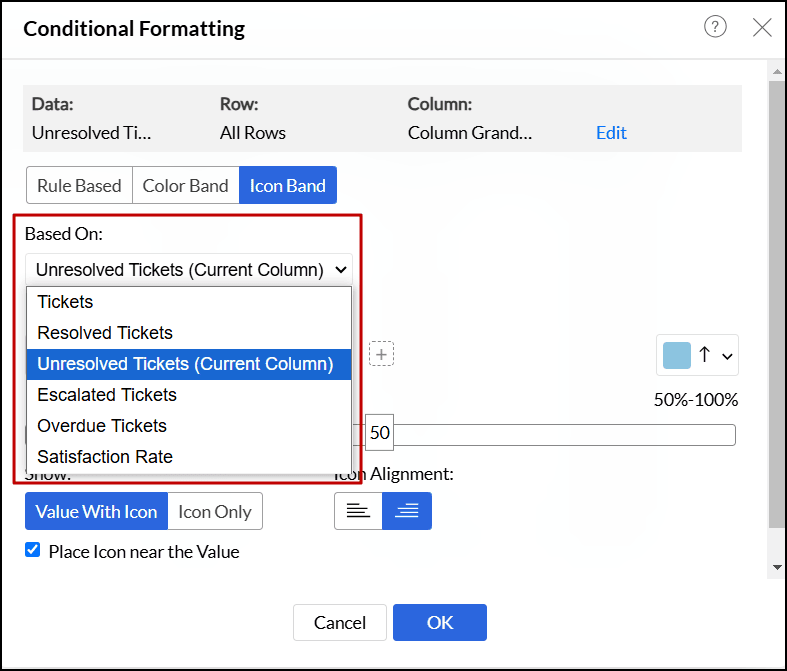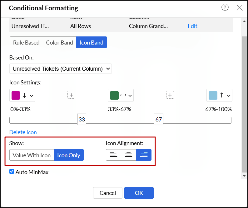 Icon Only: This option displays only the icon without the data value. You can align the icon to the left, middle, or right within the cell.
