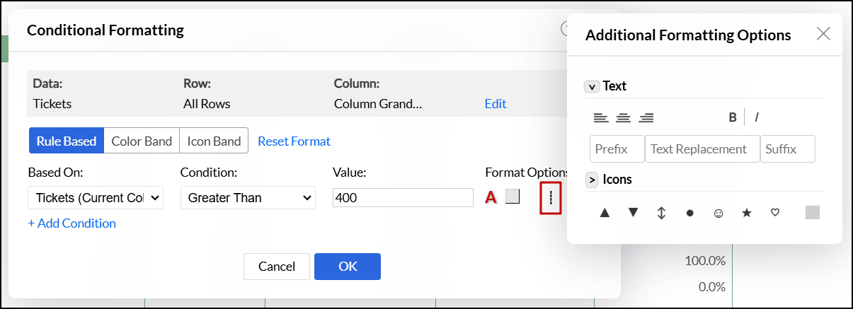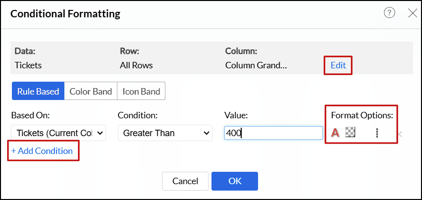 Click the +Add Condition link to add more conditions. The conditions are evaluated from top to bottom, and the appropriate formatting is applied to the data cells that meet each condition.