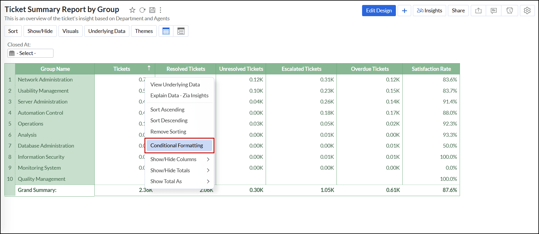 Analytics Plus lets you view and modify the conditional formats applied over the pivot view, from the Conditional Format tab of the Pivot's Settings page. Click the required data to view the corresponding conditional formats applied over it. Modify the conditions as required, and click Apply.