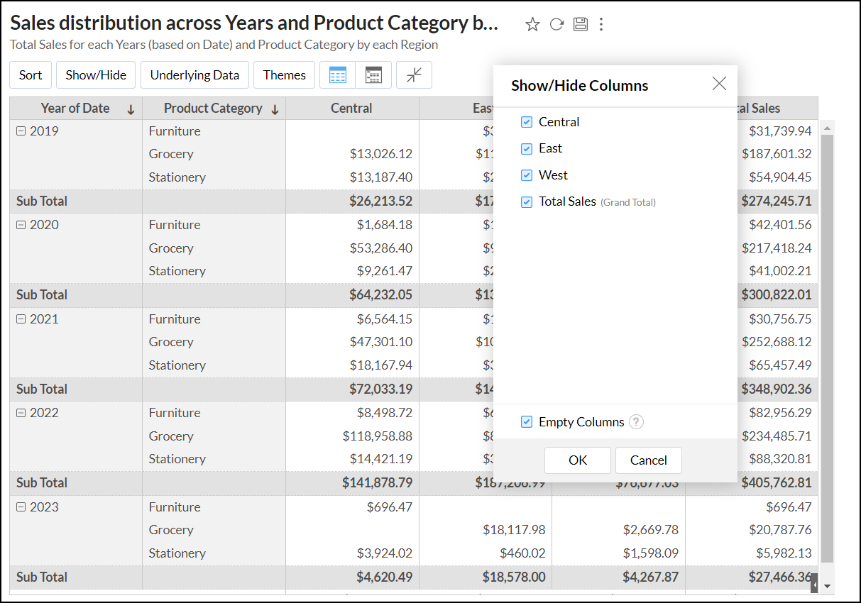 Analytics Plus lets you show or hide specific columns and totals in the pivot table.