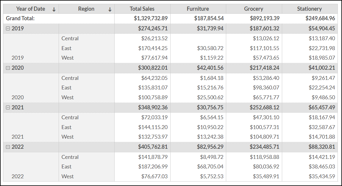 By default, Analytics Plus displays the subtotals and grand total of all the rows and columns. However, you can choose to change the position of these totals or turn them off and hide specific columns in the pivot table.