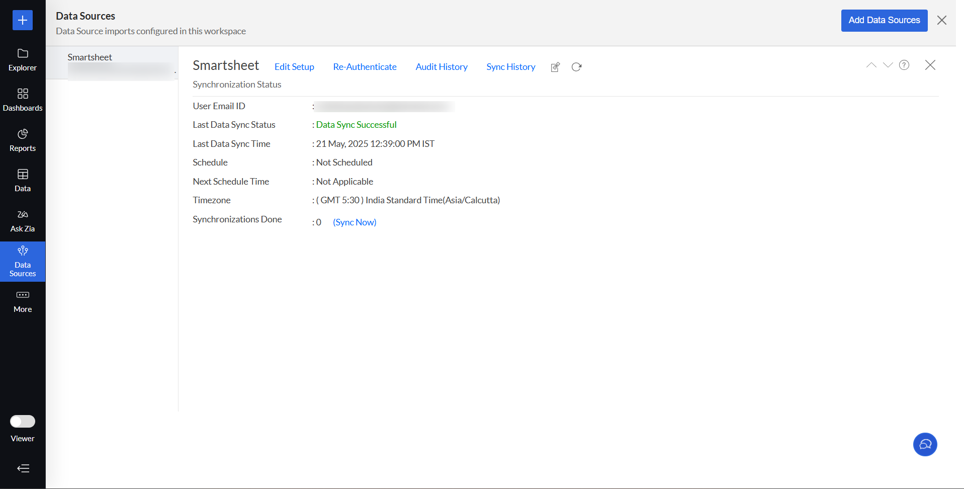 - Navigate to the Smartsheet data source, and click the Re-Authenticate link.