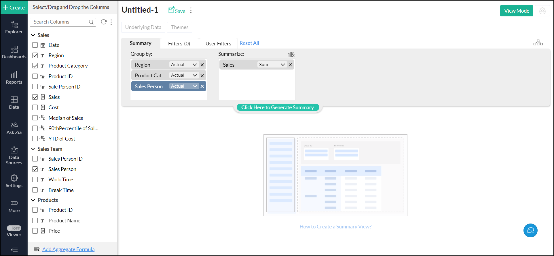 Drag and drop the Product and Region columns to the Group By shelf and the Sales column to the Summarize shelf. Click the Click Here to Generate Summary button to create the summary view.