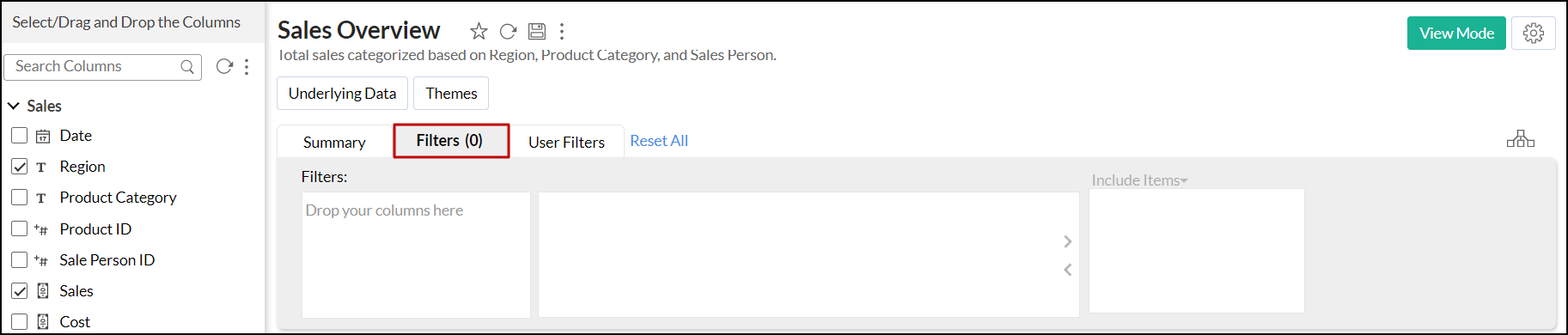 • Navigate to the Filters tab, and drag and drop the required column to apply the filter.