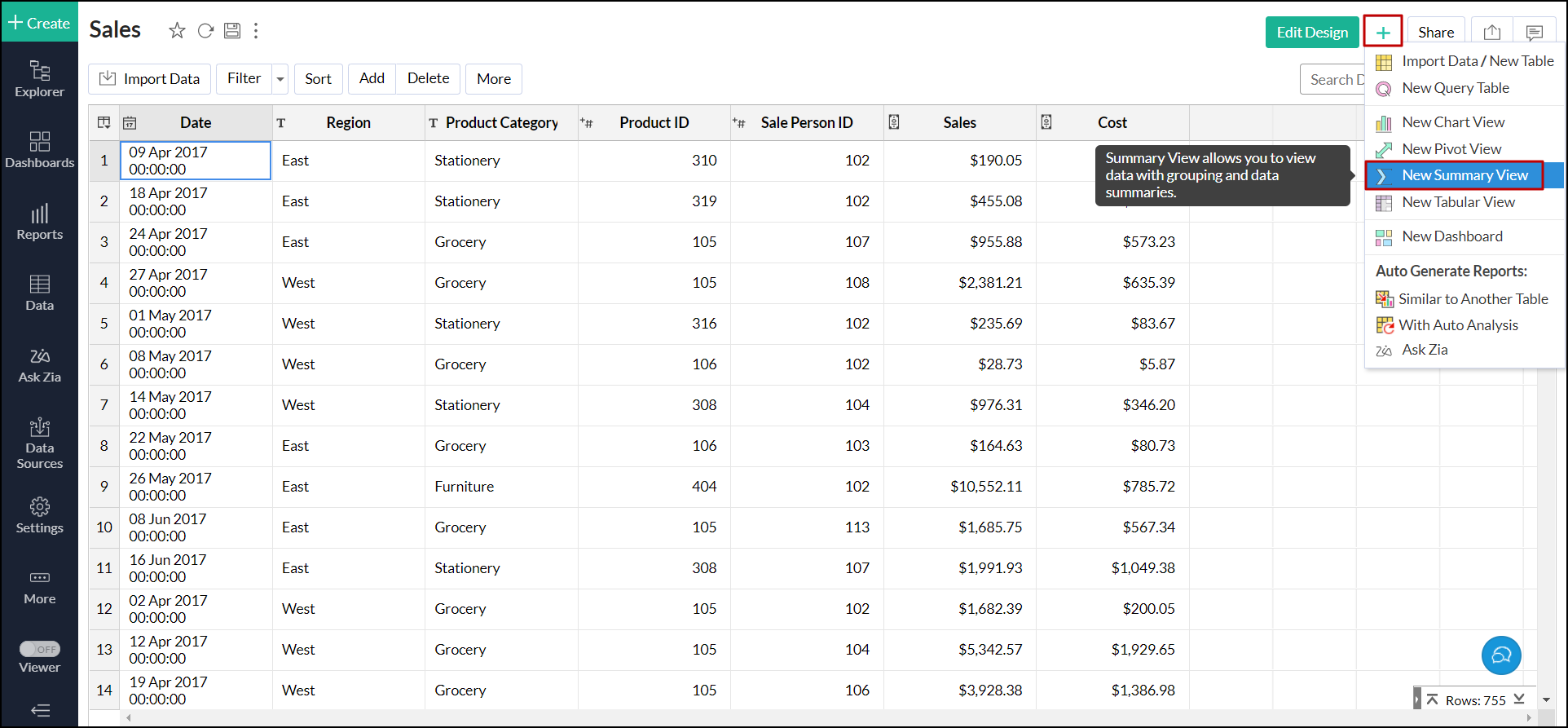 You can also create a new summary view by opening the required table and clicking the + (Create New) > New Summary View option.