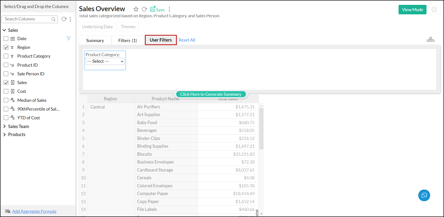 Analytics Plus also allows you to apply dynamic filters to the summary report in the form of user filters. It also offers a variety of display components for filters, such as drop-down boxes, sliders, and date range choosers. This enables users to apply filters dynamically in View mode.