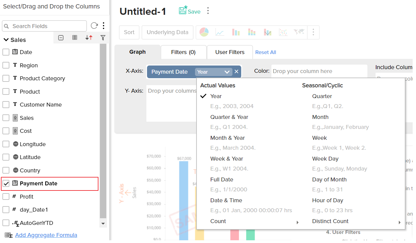 Aggregate formulas can be used while creating all reports (charts, pivot tables and summary views) as you would use a column in a table. When you create a new report over the table, in which you have added the aggregate formula, all the formulas will be listed in the Columns list pane on the left, which can be drag & dropped to create the report.