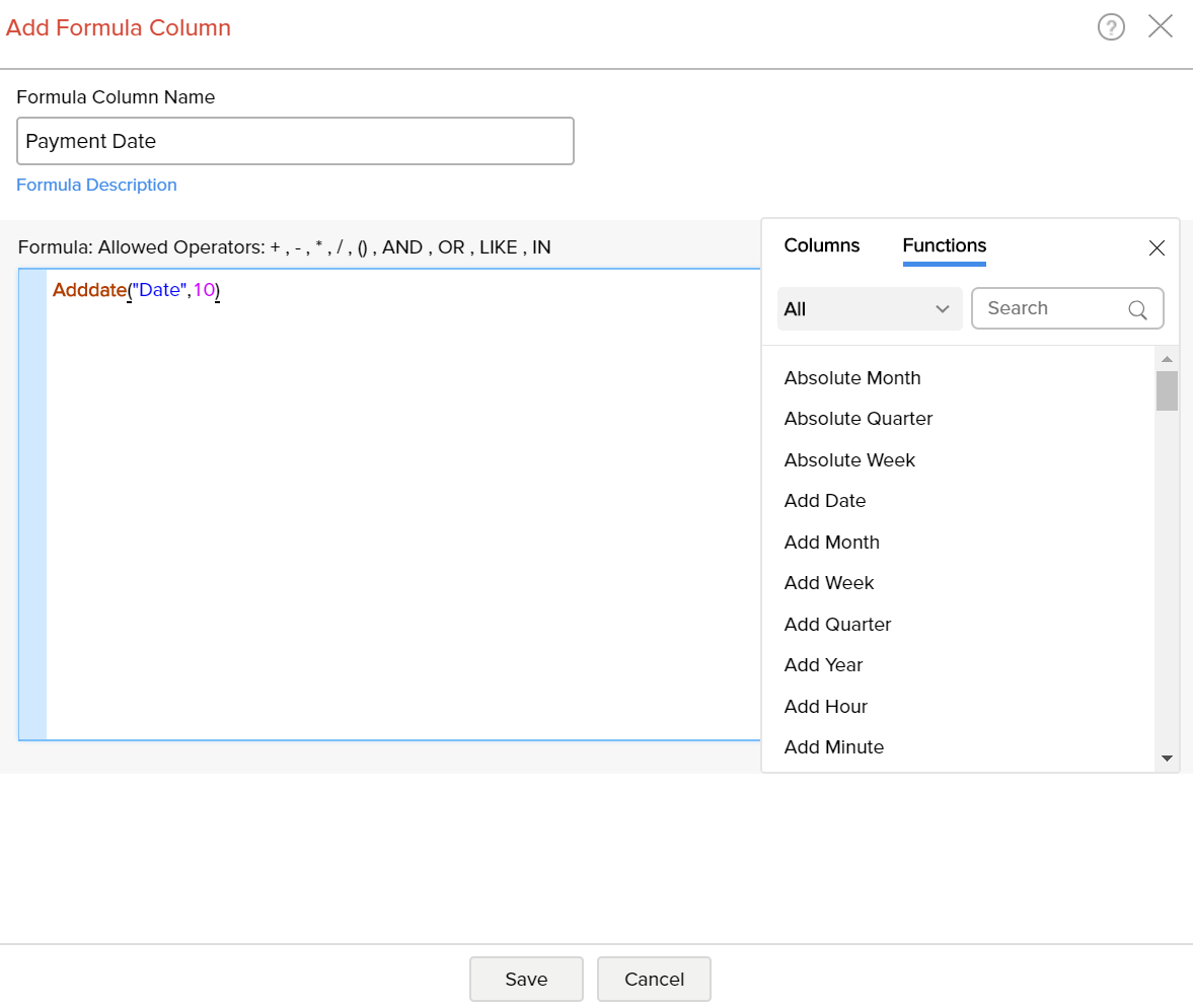 • In the Formula text box, position the cursor in between the parenthesis, select the date column to which you wanted to add date using the Columns option.
