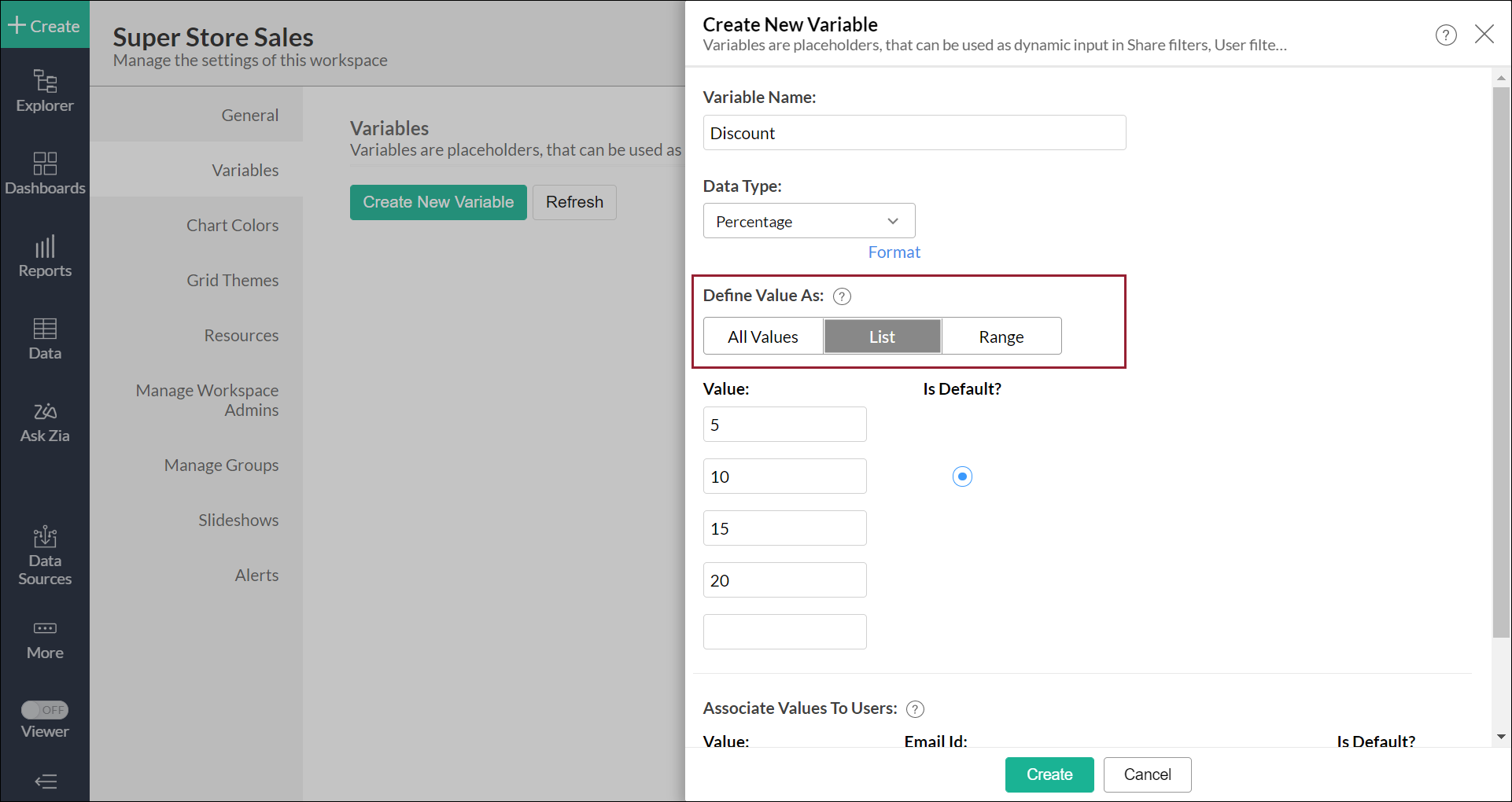 Note: When creating a variable, you can associate the values in the variable to specific users or groups. On accessing shared reports, in cases where multiple values are associated to them, shared users can employ what-if analysis to visualize changes to the report corresponding to the values associated to them.