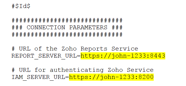 where <hostname of new server> is the hostname of the new Analytics Plus server and <Analytics port> is the port Analytics Plus runs on, in the new server and <Analytics port/iam> is the Analytics Plus accounts port in the new server. The default value for this port is 8443.