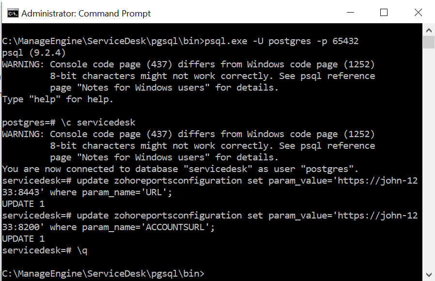 update zohoreportsconfiguration set param_value='https://<hostname of new server>:<Analytics port>' where param_name='URL';