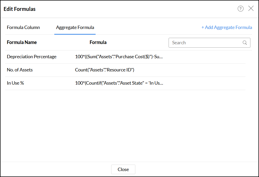 Formulas are calculations that can be defined using the powerful formula engine to create required reports. Refer this documentation to know more. There are also several default formulas created based on the AssetExplorer modules. To view the default formulas, open the required table, click Add and select the Edit Formulas option.