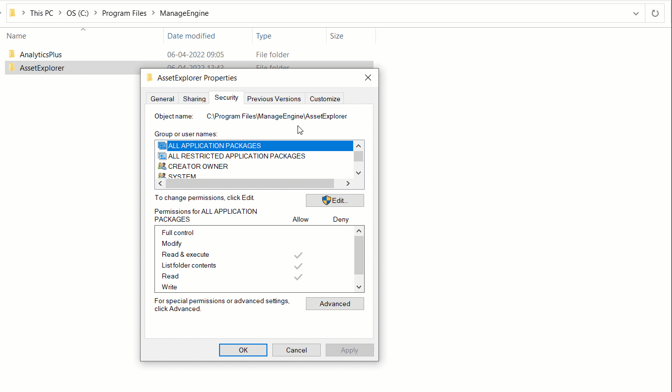 • Right-click the AssetExplorer folder, select the Properties option, and navigate to the Security tab in the pop up that appears.
