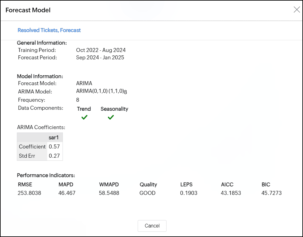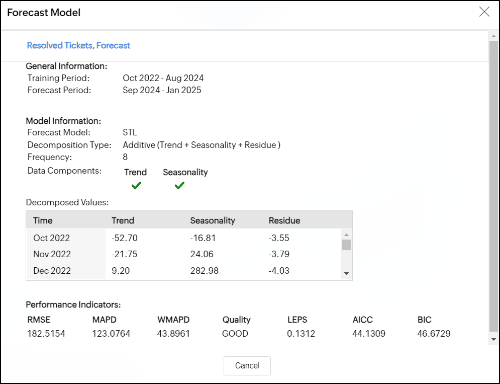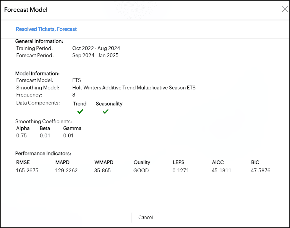 Yes, Analytics Plus lets you view the forecast model information applied over the charts. It provides details about the model used and statistical data to assess the accuracy of the forecasting model. This option becomes available once forecasting is applied. The information is specific to each metric being forecasted.