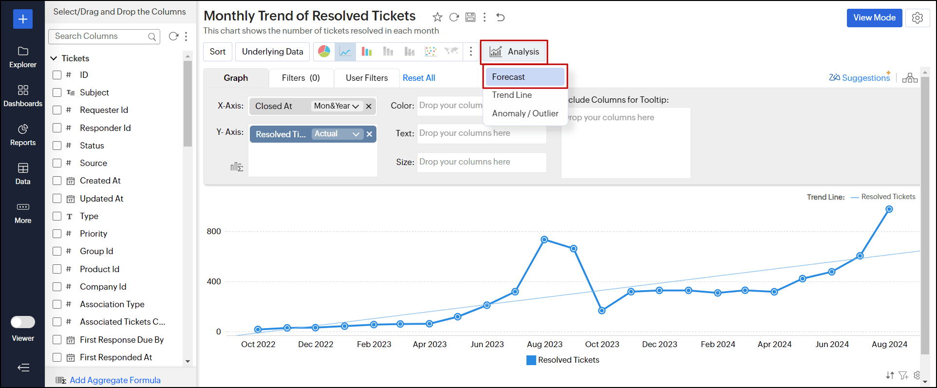 Analytics Plus allows you to predict future data trends effectively, using the forecasting feature. It is based on powerful forecasting algorithms that analyze your past data in depth, and come up with the best forecast for the future. You can set up forecasting in charts within minutes, without worrying about the underlying complexity.